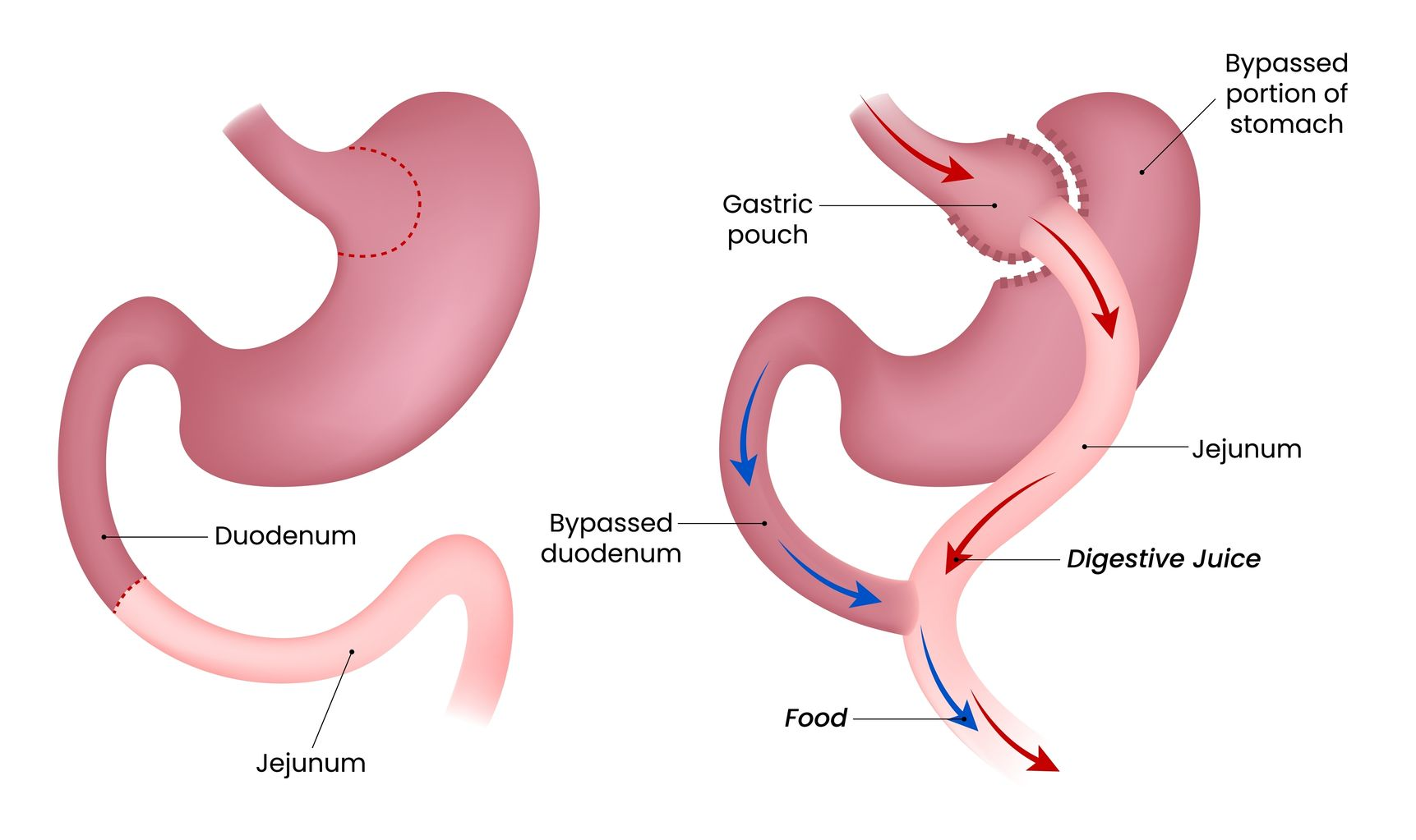 The Roux-en-Y gastric bypass is designed to create a small pouch of stomach that restricts food intake. A Y-shaped section of the small intestine is then attached to the pouch to bypass the first and second segments of the small intestine. This causes a decrease in the amount of food and calories that are absorbed by the body, thus resulting in weight loss.
